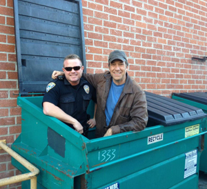 Of course, my encounters with law enforcement have varied over the years. Most recently, I found myself in a dumpster, attempting to film a non-traditional PSA for an association of Trade Schools I’m trying to organize. (It’s complicated.) Anyway, I was halfway through my spiel when a cruiser came barreling down the alley – lights flashing, siren chirping. Two cops leapt from the black and white, all business. Hands on their holsters, they moved quickly passed my baffled cameraman, and surrounded the dumpster.