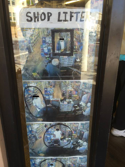Had a spirited conversation last night with some locals down at the liquor store. The subject was shoplifting, and the topic arose because of this photo. As you can see, it was taken from a security camera, and features a guy in a white tee-shirt. The headline identifies the individual as a shoplifter. The photo is posted in the front window for all to see.