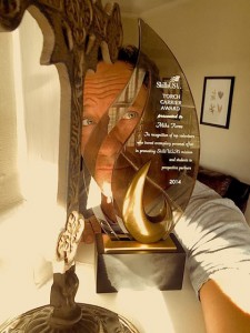 It’s called The Torch Carrier Award, and as I told the audience that watched me receive it, this one is actually going on the mantle and staying there. In my future efforts to live up to this honor, it only seems sensible to display it where the occasional house guest might notice it shining in the afternoon sun and say, “Hey Mike – that appears to be a major award you’ve got there on the mantle, shining in the afternoon sun. What’s it mean?”