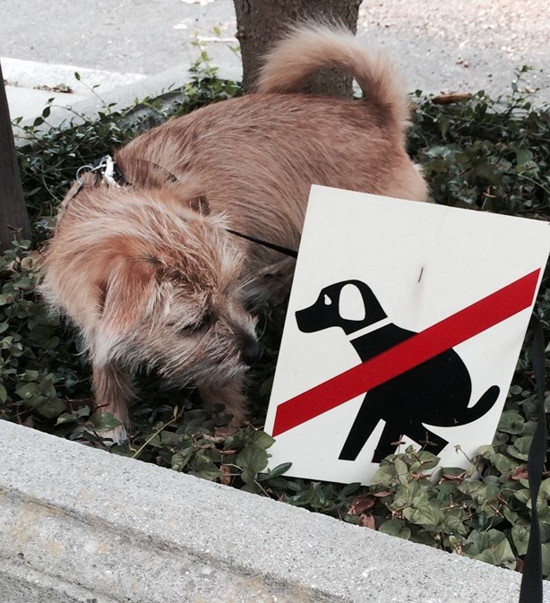 Well, I reject those fascists, and all the other Condominium Captains who troll America’s neighborhoods, looking for infractions and keeping tabs on the great unwashed. I reject the correctors and the pedants who wait in the weeds to throw the flag on the next unsuspecting soul with the temerity to venture outside of the crosswalk, or the wretched commuter who arrives home late for dinner, and dares to block his own driveway with the fender of his own car. I reject their warnings and their threats and all their castigations. But most of all – I reject their signs. And as long as I can get a leg up on them, I’ll continue to express my displeasure in the only way a lad with no opposable thumbs can hope to do.
