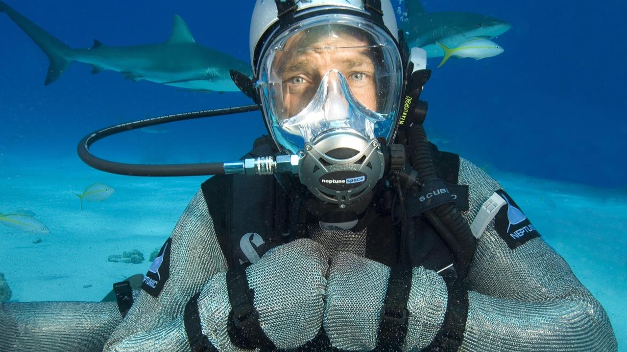 “Mike Rowe scubas in protective underwater gear as he hosts an episode of Discovery Channel’s ‘Shark Week.’ Critics say sensationalized wildlife documentaries, like some of those broadcast during Shark Week, do more harm than good.”
