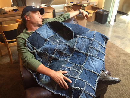 Several months ago, a woman named Judy offered to make a “lap quilt” out of my old blue jeans. Beyond this shameless and transparent attempt to get in my pants, her offer seemed a sensible way to transform my old clothes into a potentially valuable piece of C.R.A.P., and auction off the resulting handiwork to benefit the mikeroweWORKS Foundation. So I sent Judy 8 pair of used jeans, and waited to see what she would do with them. Today, I found out, as the attached video illustrates. Give it a look, and prepare yourself for another Collectible – Rare and Precious.