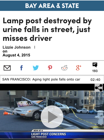 Apparently, the culprit is not rust, or time, or erosion, or vandalism, or faulty construction, or wind, or the relentless tug of Newton’s Second Law. No, the problem is far more insidious. According to city officials, the light pole succumbed to the deleterious effects of dog pee.