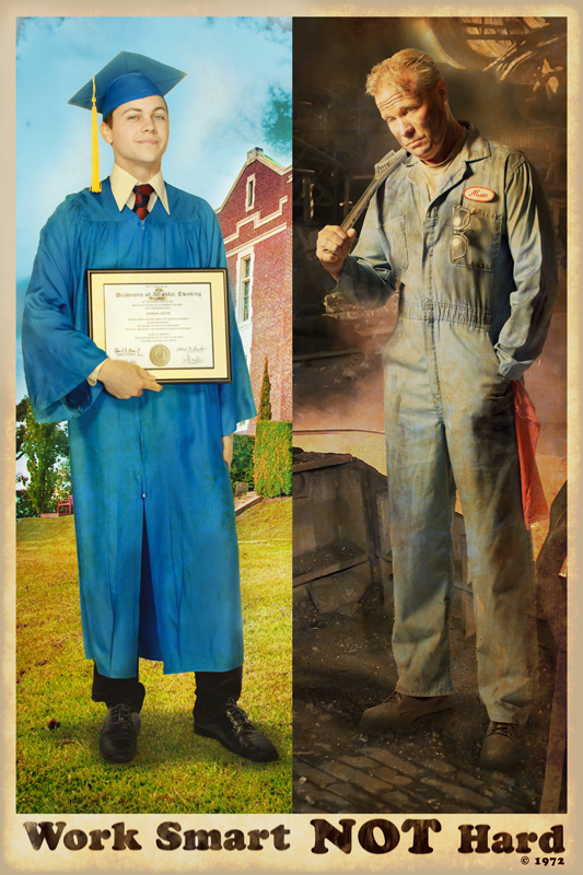 Back in 1980, my high-school guidance counselor told me the local community college was “beneath my potential.” Mr. Dunbar wanted me to apply at James Madison or Penn State. He said a two-year school would put me on the wrong path, and lead to a life of “wrench-turning.” He then pointed to this poster, part of the “Push for College” campaign in the late seventies, hanging on his office wall. “Which one of these guys do you want to be, Mike?” I still remember the caption on the poster – “Work Smart, Not Hard.”