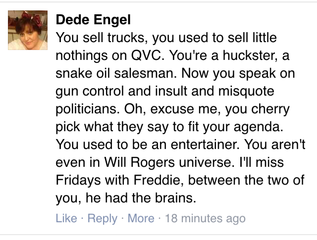 Point is Dede, even if the hard-to-get thing doesn’t work out for you, there’s no upside in flanking your pretty face with a flurry of ugly insults and posting them in a place where the whole world can see your disenchantment. You might be happier following one of the millions of other famous bipeds who share your thoughts on guns, politics, and advertising. But then again Dede, where’s the fun in that?