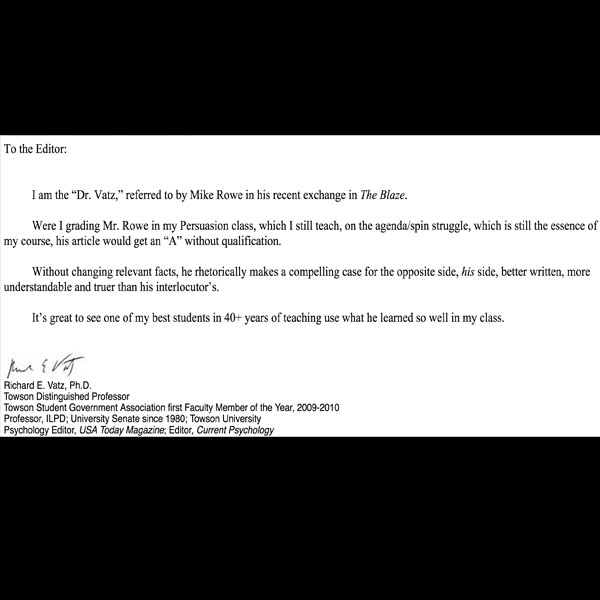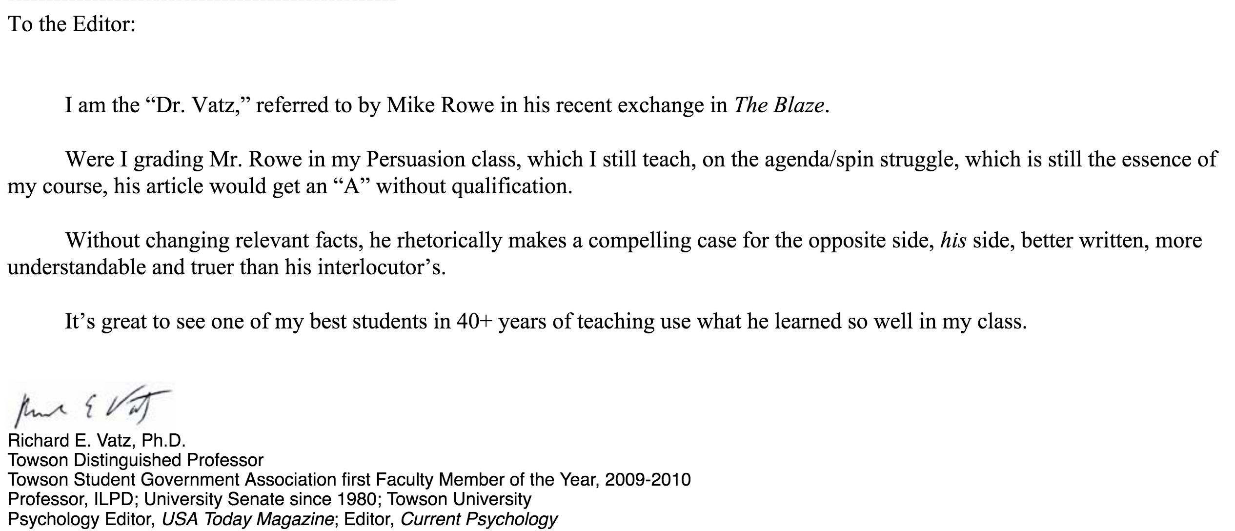 PS. The best part of all this, for me, is an unexpected email from Dr. Vatz, a professor of rhetoric and persuasion from my old alma mater. After invoking his name in my earlier screed, he was kind enough to send this to me. It’s not quite as satisfying of getting an “A” in his class….