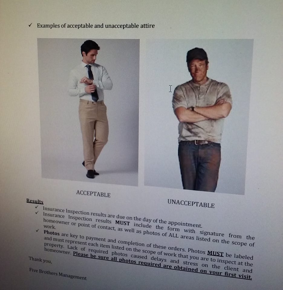 Consider my own recent inclusion in the employee handbook for Five Brothers Default Management Solutions. As you can see, when it comes to workplace fashion, The Five Brothers have deemed my sartorial choices as “Unacceptable.” Why? Clearly, Five Brothers prefers the look of freshly-laundered, malnourished millennials who go belt-less and wear dance slippers.