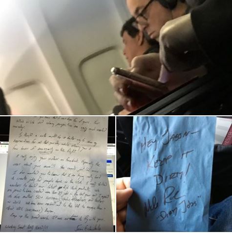 Later though, this same guy reaches across the aisle and hands me a note. Judging from the signature, this is the guy you’re talking about. Unless of course, there are two Jason Eichenholz’s on this flight. (This is him, working on a spreadsheet in 6E. Not that I was eavesdropping, but he appears to be involved in some very technical stuff.)