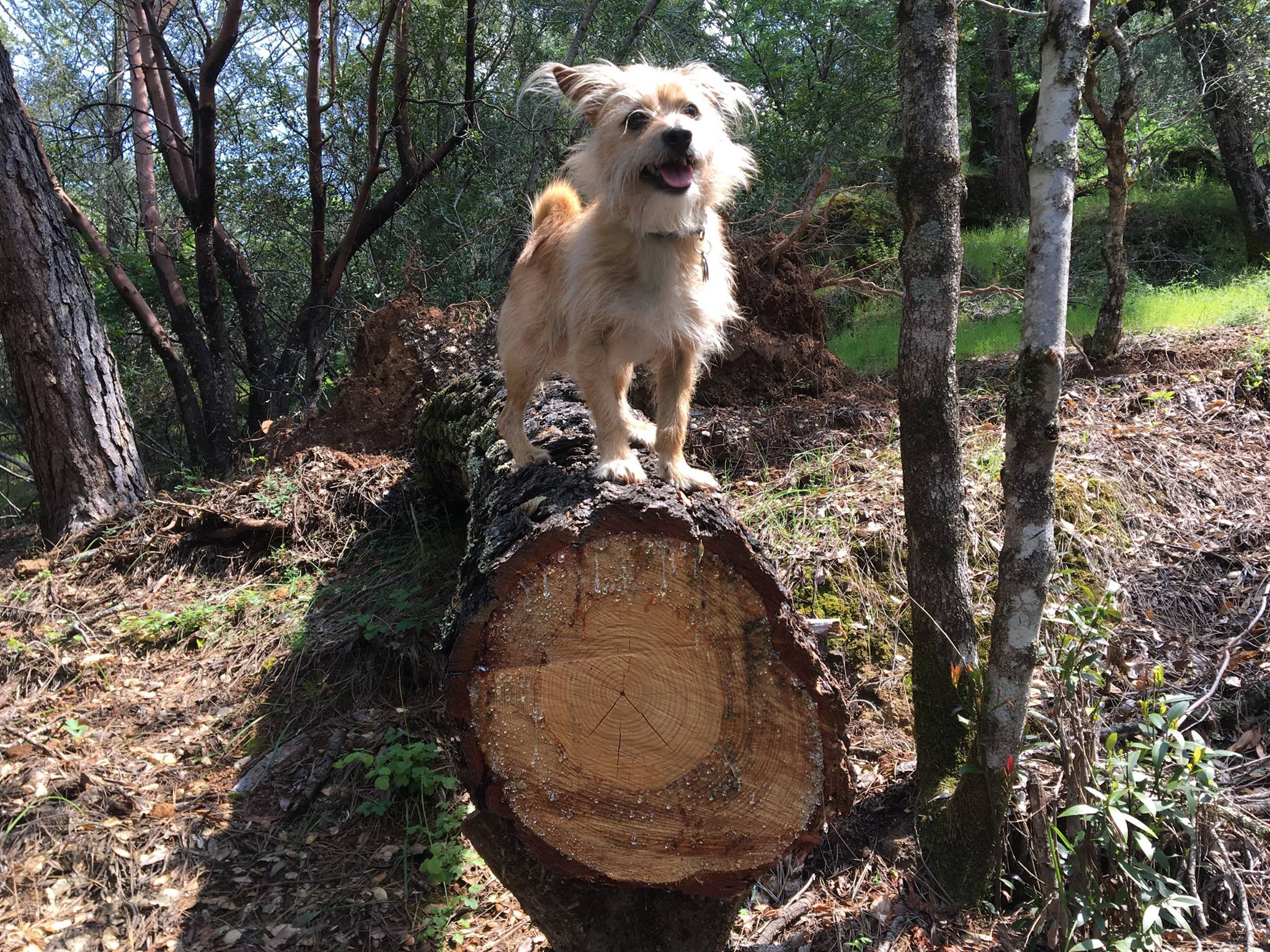 The tree is a fascinating thing, Sharon. It bleeds with something that tastes delicious, but clings to my teeth like peanut butter on steroids. And the woods are full of mysterious smells and strange piles of crap that come from creatures I hope to never encounter. A pine cone, by the way, is the finest chew toy ever invented, with the possible exception of a champagne cork. And acorns are a consummation devoutly to be wished. But mostly it’s the wood that has my attention, on this very good Friday.