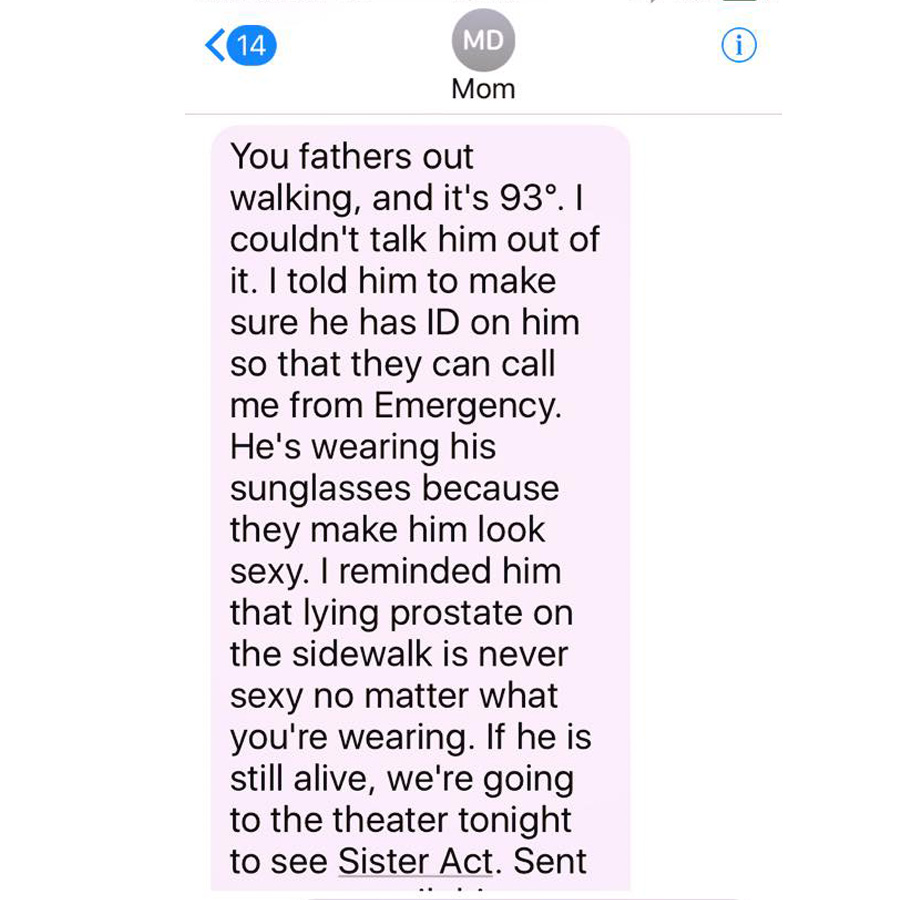 Mike – what’s new with your mother? Haven’t heard from her in a while. Any new stories?Diane Weiss Hi DianeShe’s fine, but she’s got a lot going on. Here’s the most recent text, received a few minutes ago. Now, you know what I know.