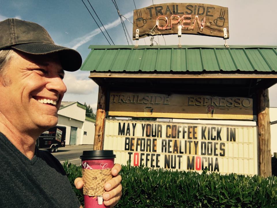 Hi there, Donna. I’m flattered to be the object of your curiosity. Currently, I’m outside of Seattle, enjoying my favorite part of the Pacific Northwest – coffee stands. This one is excellent. It’s called Trailside Espresso. To keep up appearances, I’d like to tell you I’m enjoying a cup of black coffee. But actually, it’s a toffee-nut mocha. Please don’t tell anyone.