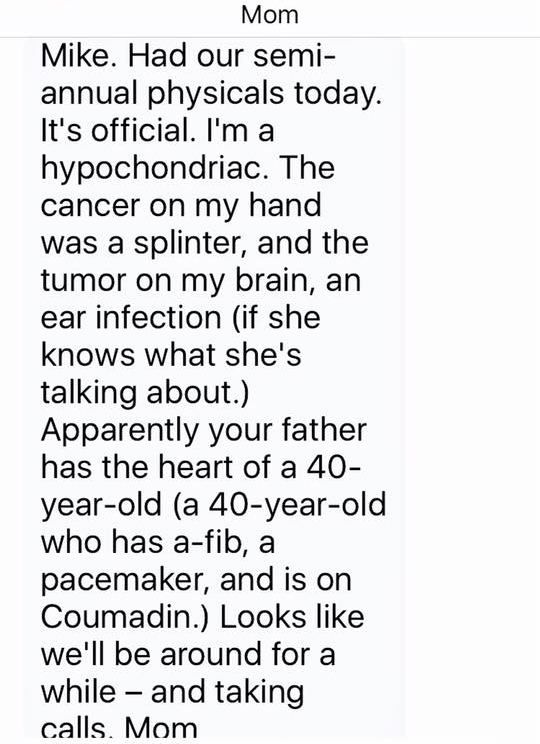 Deprecated: The called constructor method for WP_Widget class in WEN_Business_Contact_Widget is deprecated since version 4.3.0! Use __construct() instead. in /home/mikerowezestsms/public_html/wp-includes/functions.php on line 5506 Texts From Mother: Semi-Annual Physicals – Mike Rowe