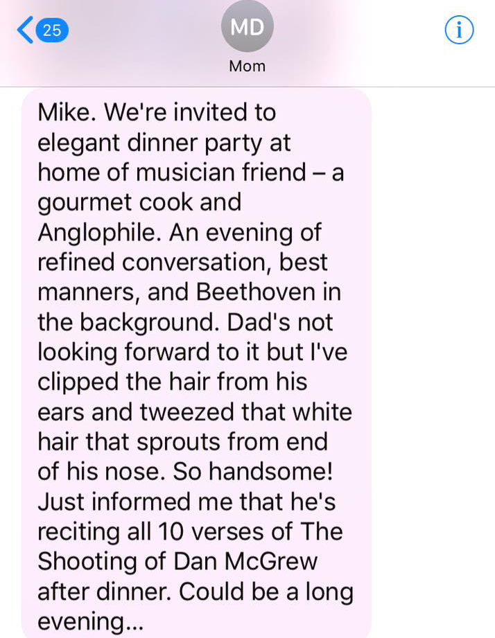 Deprecated: The called constructor method for WP_Widget class in WEN_Business_Contact_Widget is deprecated since version 4.3.0! Use __construct() instead. in /home/mikerowezestsms/public_html/wp-includes/functions.php on line 5506 Texts From Mother: We’re Invited to an Elegant Party – Mike Rowe