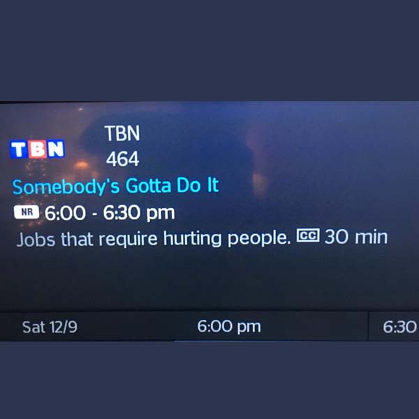 Thank you so much for alerting your viewers to the correct day, date, and time of my show. Thanks also for spelling the name of the show properly. One small favor: In the spirit of actually persuading people to watch the program, I’d be grateful if you would consider changing the description from Jobs that require “hurting” people, to Jobs that require “helping” people.