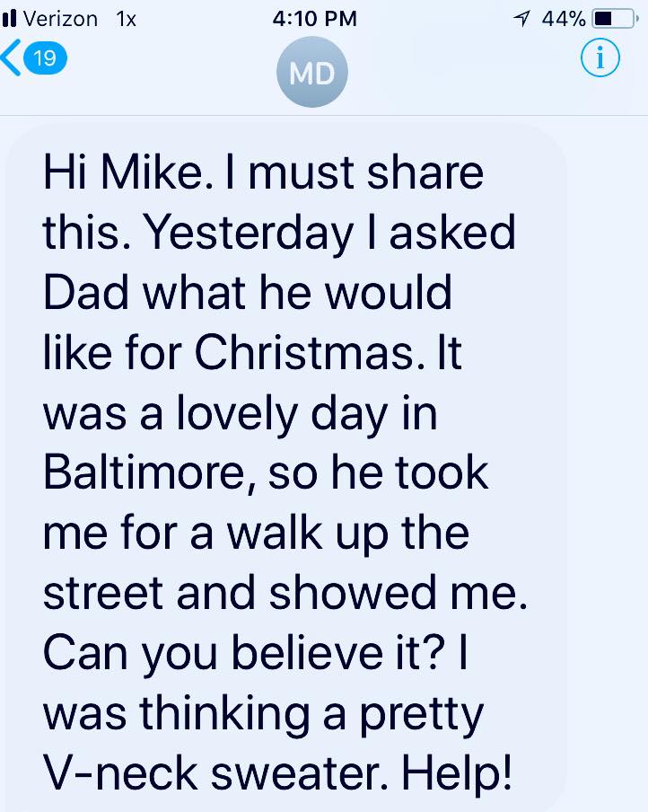 Deprecated: The called constructor method for WP_Widget class in WEN_Business_Contact_Widget is deprecated since version 4.3.0! Use __construct() instead. in /home/mikerowezestsms/public_html/wp-includes/functions.php on line 5506 Texts From Mother: Dad Wants for Christmas – Mike Rowe