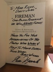 “His name is George Kreuscher. He was a Fireman for 31 years in New York City. He’s a big fan of what you do and what you stand for. And he really wants you to have his book.”