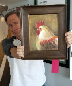 Secondly, I want to thank everyone who bid in such dramatic fashion for The Chairman of the Board – especially Nelda Sue Yaw, who wrote a very generous check to the mikeroweWORKS Foundation for $12,200. (Honestly, if I’d known my cock would fetch such a pretty penny, I’d have offered him up a long time ago.) Thank you, Nelda, sincerely. Every penny will go toward our work ethic scholarship program. Meanwhile, The Chairman of the Board is on his way to you, along with an autographed copy of my mother’s book. Please enjoy the latter, and make sure the former is hung well.