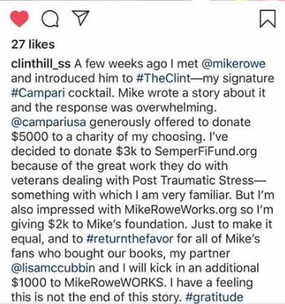 Thanks, Clint and Lisa, for your generosity. Everyone at mikeroweWORKS is tickled pink. (Or Compari red, if you prefer.)