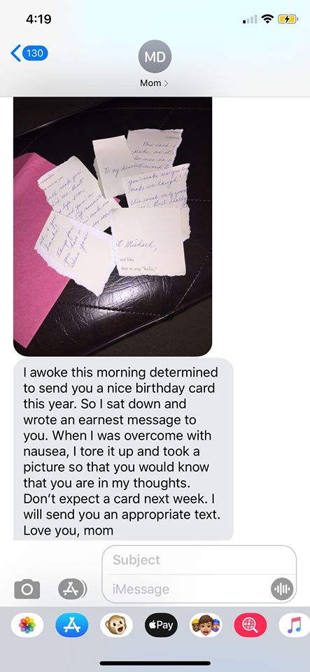 On the other hand, it possible I come by suspicion of earnestness honestly. I just found the attached text from my mother, who tried but failed to send me a birthday card earlier this month. It was her lack of earnestness, apparently, that doomed her efforts…