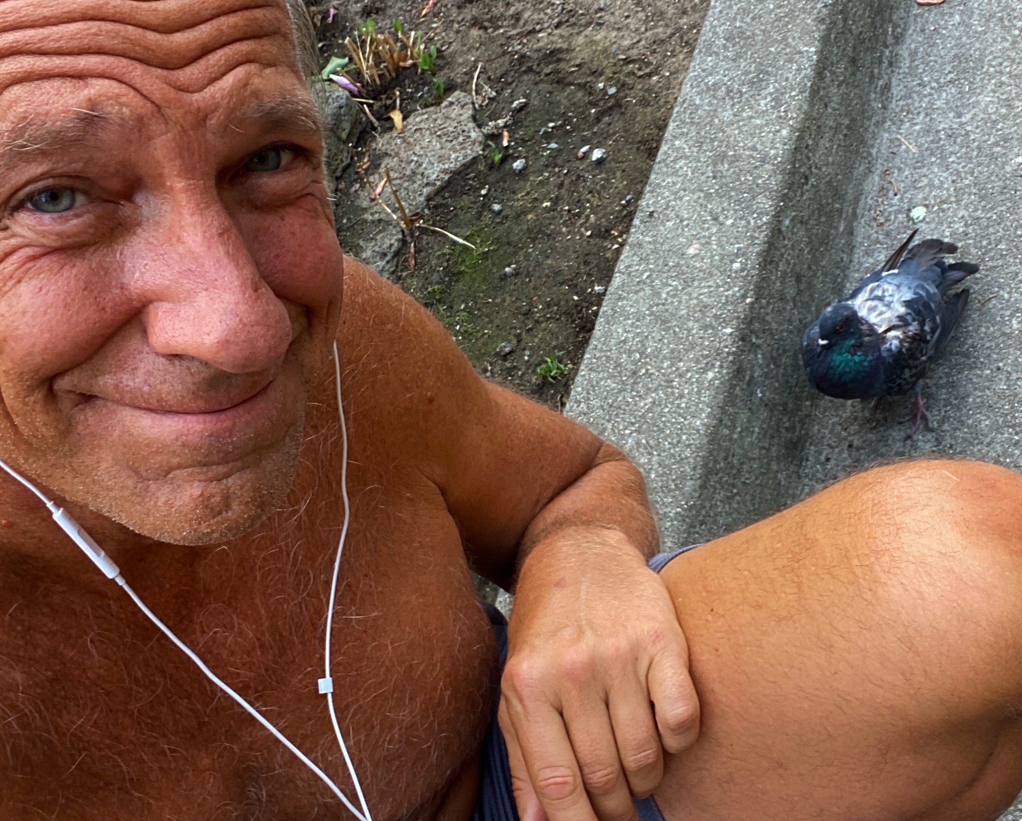 Does the pigeon know the only thing between him and certain death is a shirtless, B-list celebrity? I don’t know, but it’s pretty clear to me. If I continue on my way, the hawk will swoop down and finish what he started. So, the question is self-evident: what’s a shirtless B-list celebrity to do?