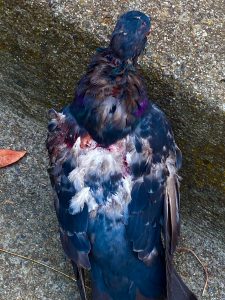2. Crush the pigeon’s head with a nearby rock. Brutal, yes, but it would be a quick death, and vastly superior to being eaten alive. If the pigeon is doomed anyway, why not put him out of his misery as painlessly as possible, and leave the carcass for the hawk?