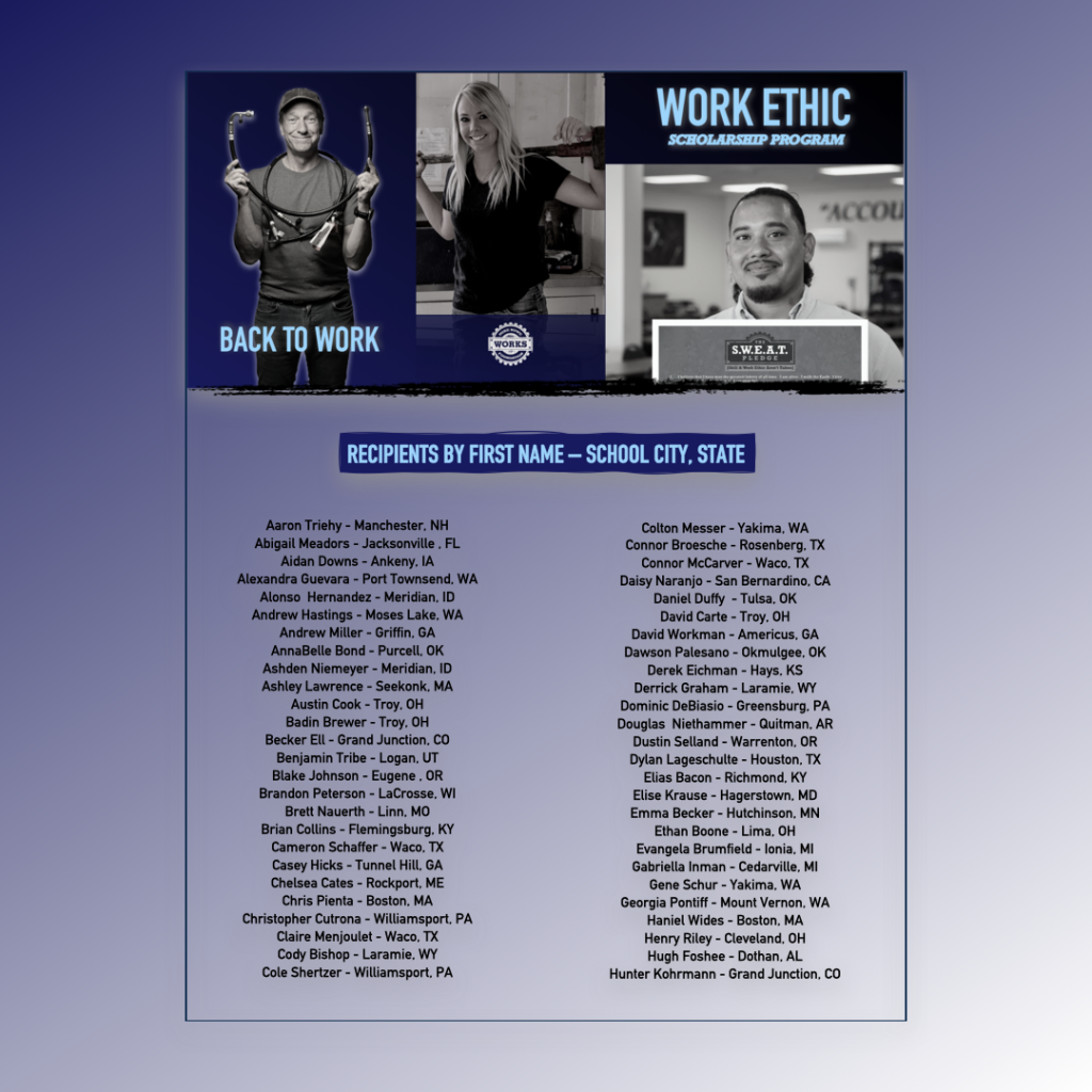 This year, the mikeroweWORKS Foundation is awarding $1,050,750.00 in work ethic scholarships to 138 individuals, in thirteen different trade programs. The names of this year’s recipients are attached.