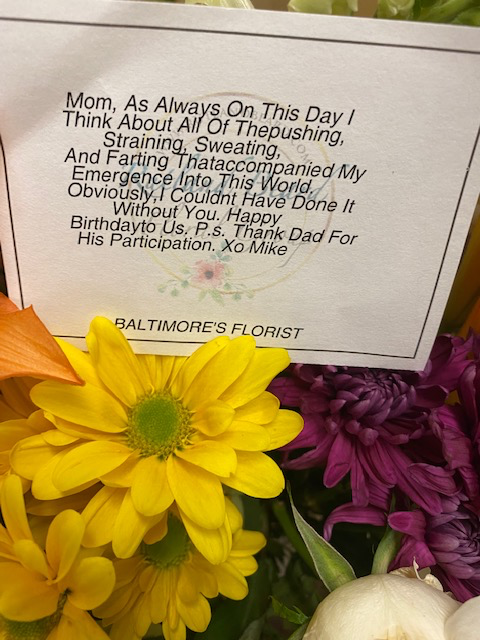 Thanks for the kind words. I can’t disagree with your observations, and can only say – in my defense – that I didn’t think my mother would share the card that accompanied the flowers. I wrote what I wrote partly because I’m pretty sure that all births require a measure of “sweating, straining, pushing, and farting,” but mostly, because I knew that somebody would have to type the message out on my behalf. That pleased me in ways that probably shouldn’t delight a sixty-year-old to this extent, but whatever. I am what I am.