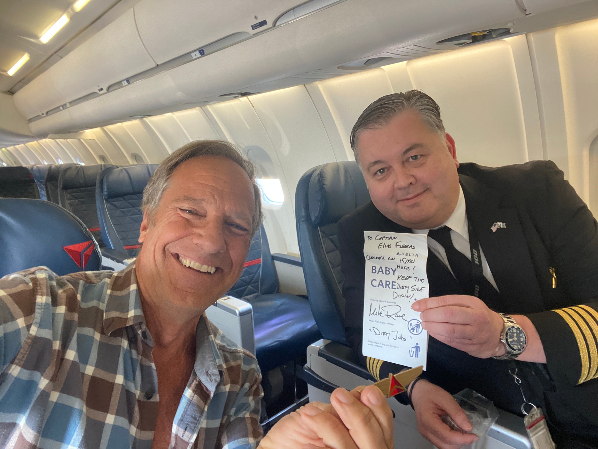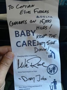 Also, of note – the Captain of this flight has just logged 15,000 hours of flying time. Quite an accomplishment. His name is Elias Flessas, (another terrific name.) I think it’s Greek, which would make this the first time I’ve ever flown to Fargo to with the help of a Greek pilot to talk about my vision with the Chamber of Commerce. According to the flight attendant, Captain Flessas is a fan of Dirty Jobs, so I autographed my barf bag and presented it to him on the way off the plane. In return, he gave