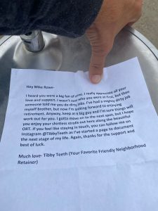 I learned this earlier today, when I jogged past the water fountain where “Tibby” has resided for the last 5 days, and saw that he (or she?) was finally gone. In her, (or his?) place, was an envelope, tapped to the top of the fountain and addressed to me. Inside the envelope was a short note from the retainer, announcing his/her (their?) plans for the “next stage of life.” According to the letter, Tibby – a true mouthpiece, if there ever was one – has gone in search of greener pastures. If the letter is to be believed, you can now follow her/him on Instagram, @TibbyTeeth, where the retainer is currently taking questions and dispensing advice.