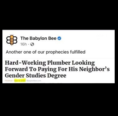 Two years ago, this was the headline of an article in The Babylon Bee. I laughed at the time, because it was satire, and it was funny, and frankly, I didn’t think it would happen. Today, I’m not laughing. Because today, a satirical headline is now the sad truth. Sad for the plumber, and sad for the country. But sad too, for the plumber’s neighbor, a woman with a gender studies degree she couldn’t afford.