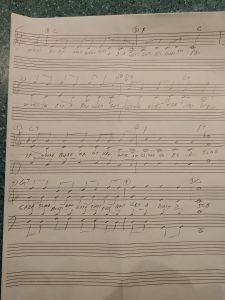 I’m not very good with sheet music, (writing or reading) but my friend Mike Gellert is, and he transposed this for me. He also made it into an actual arrangement, which I’ll post in the comments. Good luck!