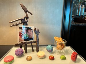 delivered to my room, put together by an amazing pastry chef at The Four Seasons named Maruschka Ang. As you can see, Maruschka found a photo of me holding a feral chicken I’d captured some years ago in Miami. She put the photo inside a coaster made of translucent sugar, mounted it on an easel made of chocolate flanked by a delicious assortment of hyper-realistic yet completely comestible hand tools, alongside a container filled with chicken