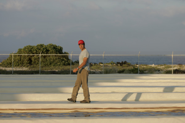 June 29. Kona, HI: Mike Rowe, host of the Discovery Channel’s Dirty Jobs at Mera Pharmaceuticals, a micro algae farming company in Kona, HI, June 29, 2005. (Discovery Channel)